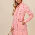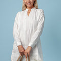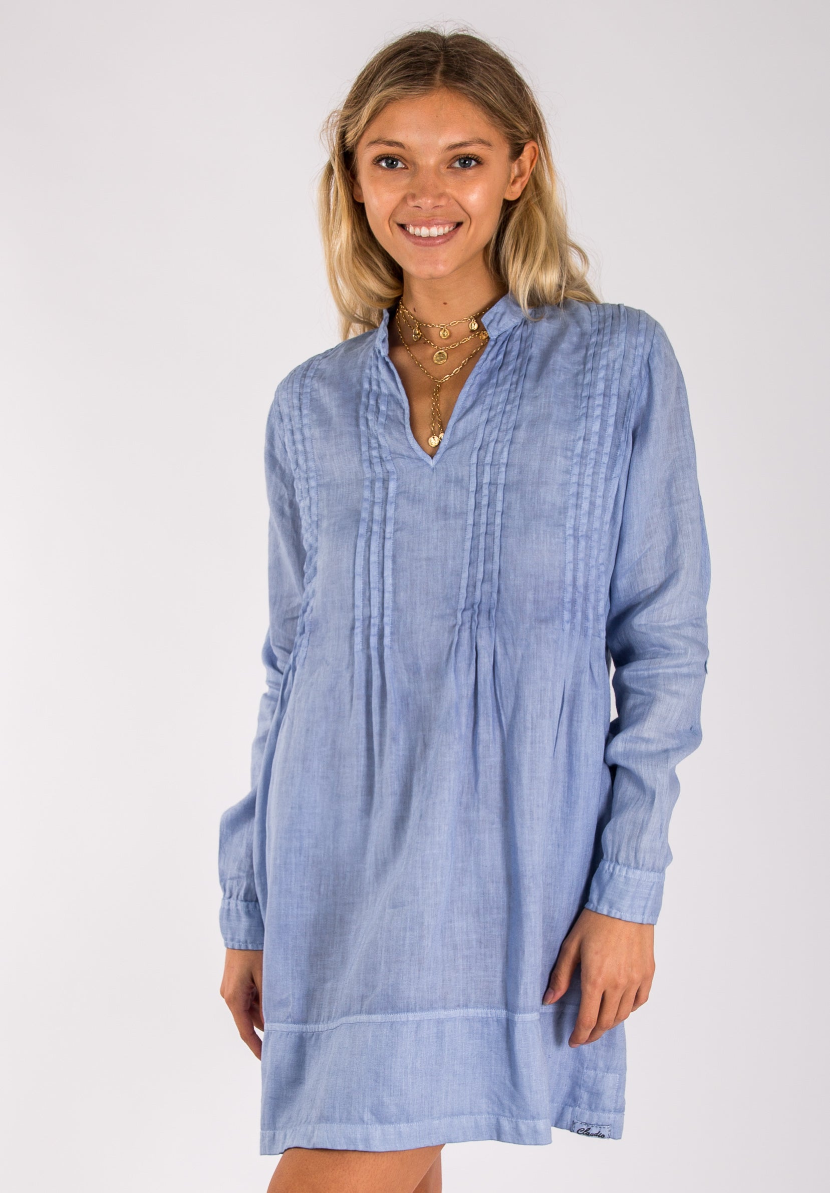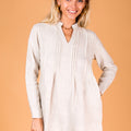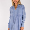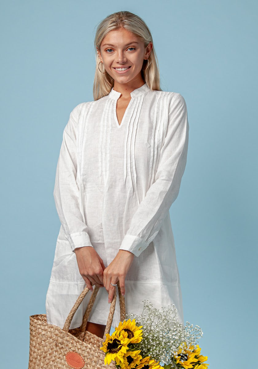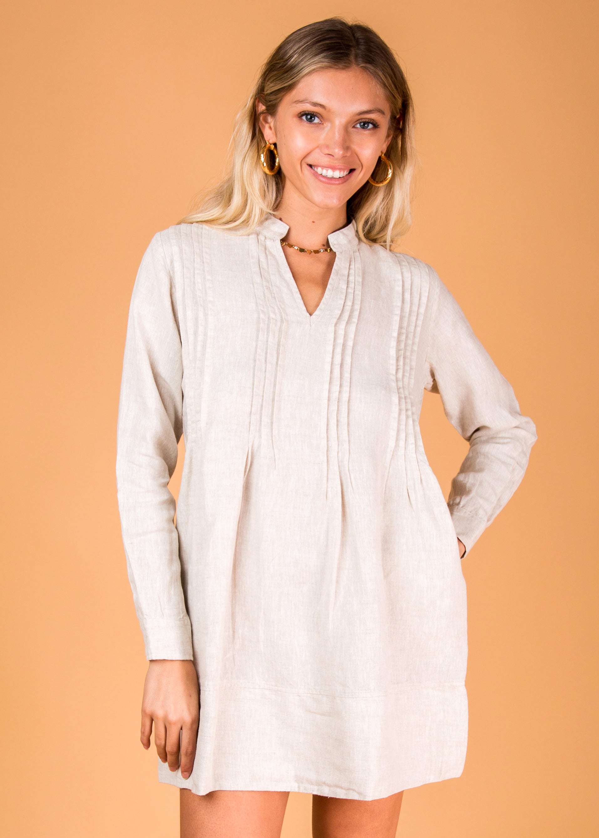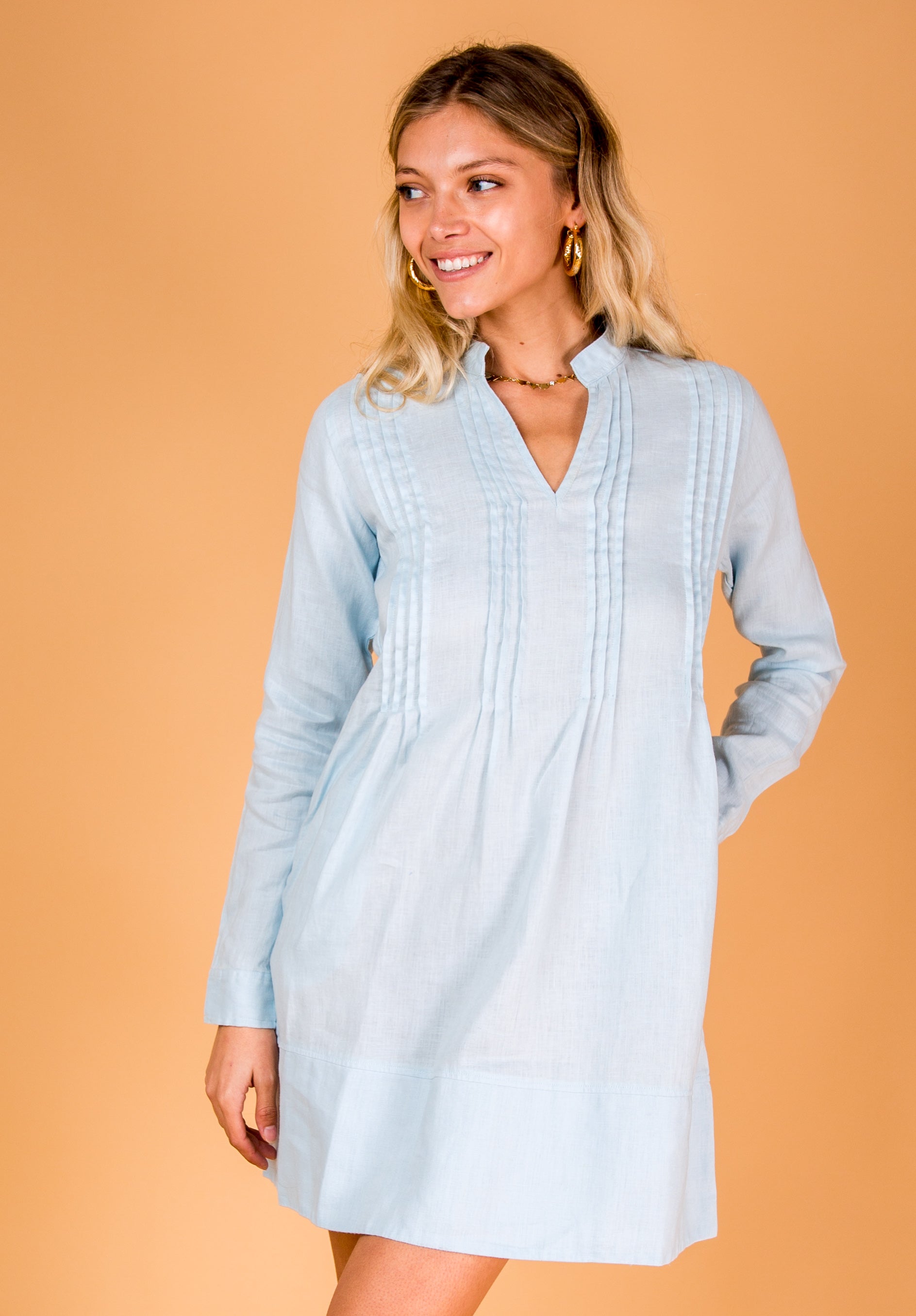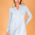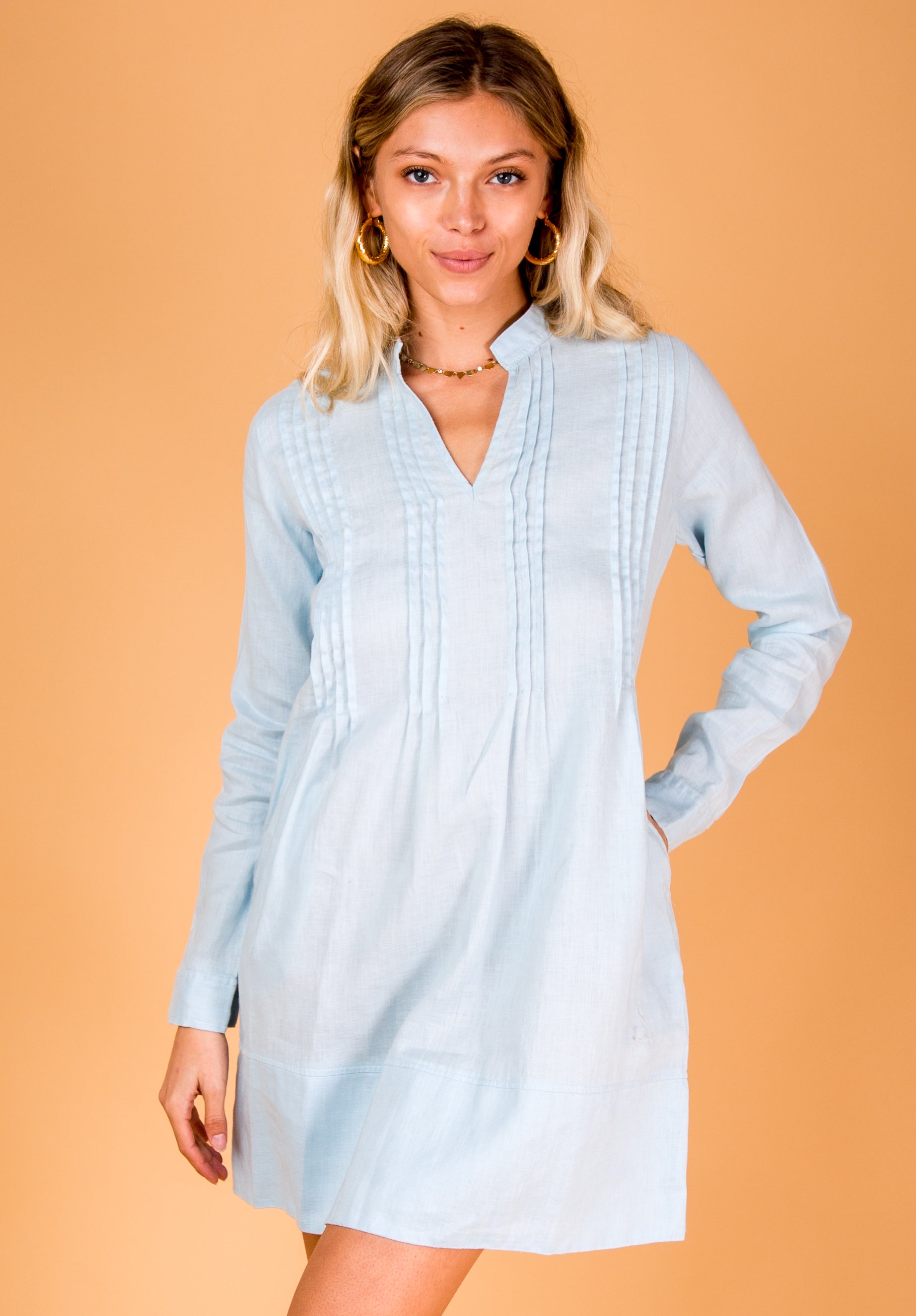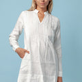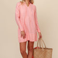 Indulge in the serenity of a secluded coastline as you sip seaside drinks in this cozy shirt dress tunic. With its delicate thin pleats and crisp open collar, it exudes effortless elegance while offering ultimate comfort. Crafted for laid-back days and spontaneous adventures, this dress makes every vacation moment feel relaxed and stylish.