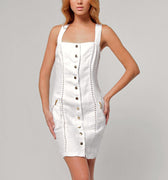 Perfect for date night or a posh vacation, this linen silhouette dress exudes effortless sophistication. The sensual shape is complemented by gold buttons and zippers, adding a touch of refinement. The eyelet design along the sides elevates the style, making this dress a chic, standout piece for any occasion.