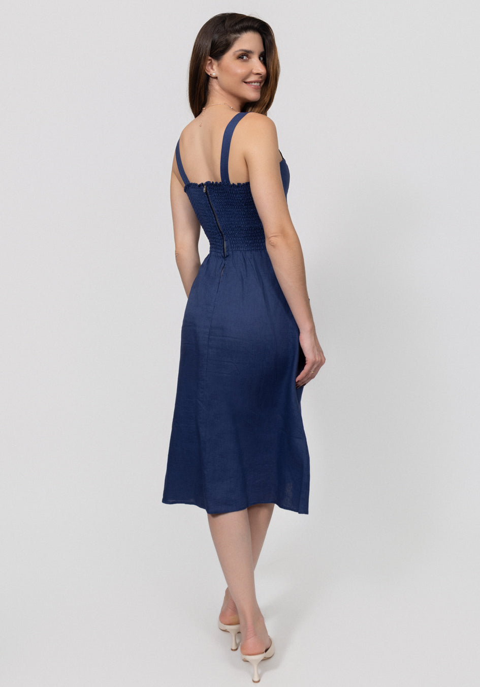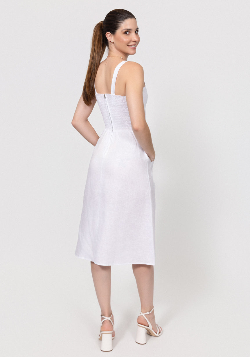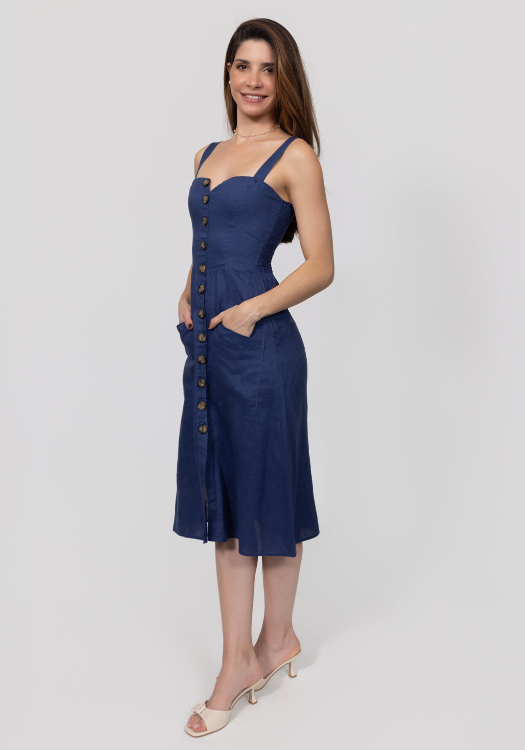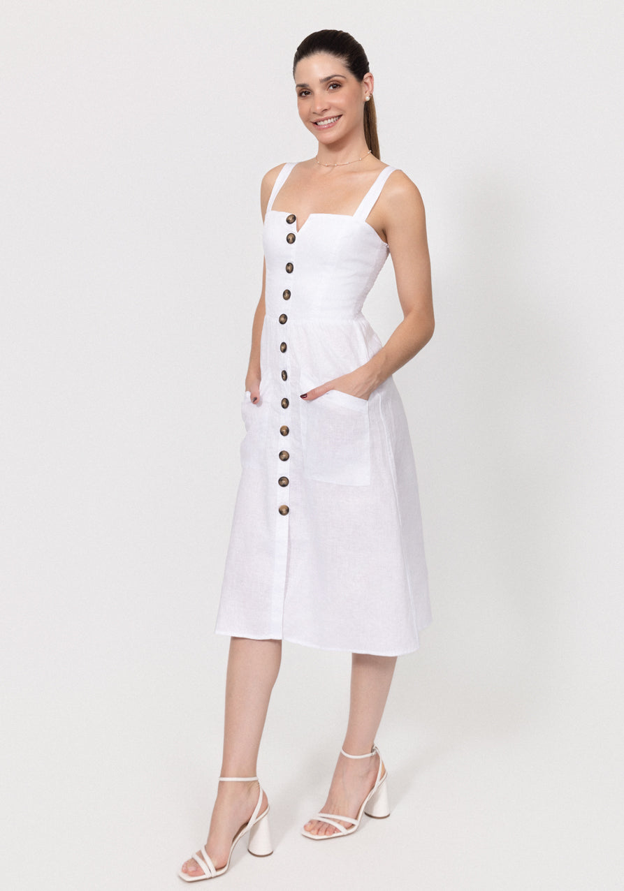 Effortlessly refined with a timeless silhouette, this linen midi dress captures the essence of relaxed, warm-weather style. Made from breathable, high-quality linen, it features wide straps and a gently defined waist that flows into a naturally draped skirt. A row of delicate buttons graces the front, adding a classic detail that enhances the dress’s understated elegance, while practical side pockets bring everyday ease to the design. Whether worn with sandals for sunny afternoons or layered with light accessories for evening plans, this dress offers a sense of comfort and quiet sophistication that feels right for every occasion.