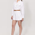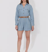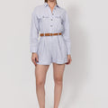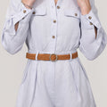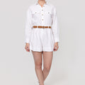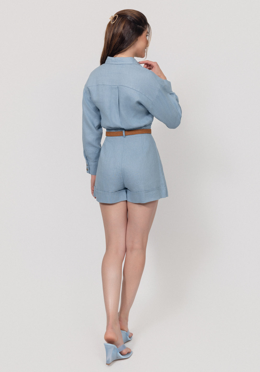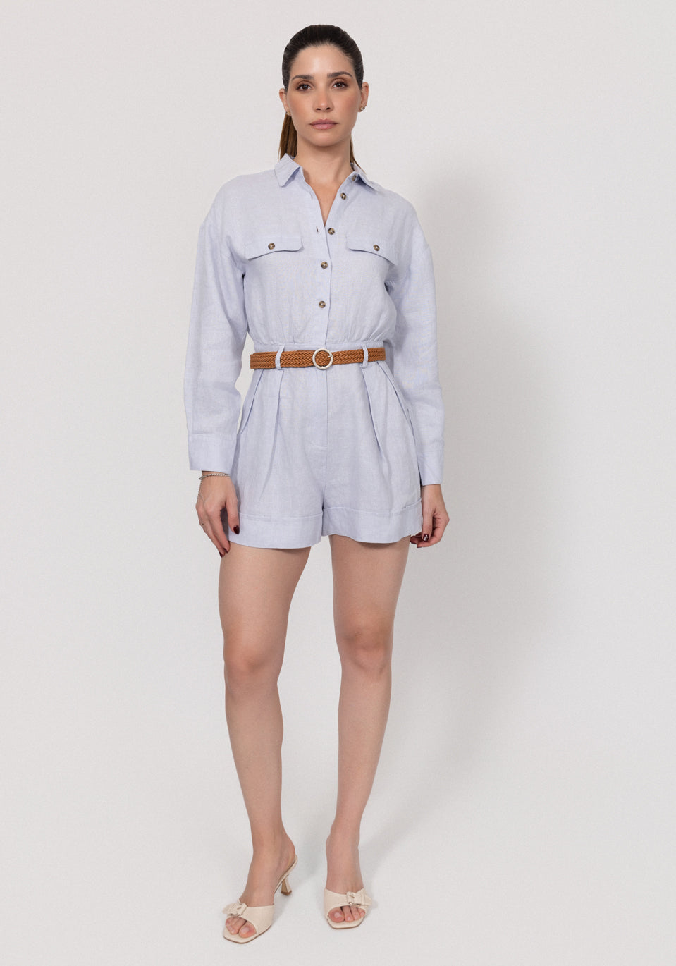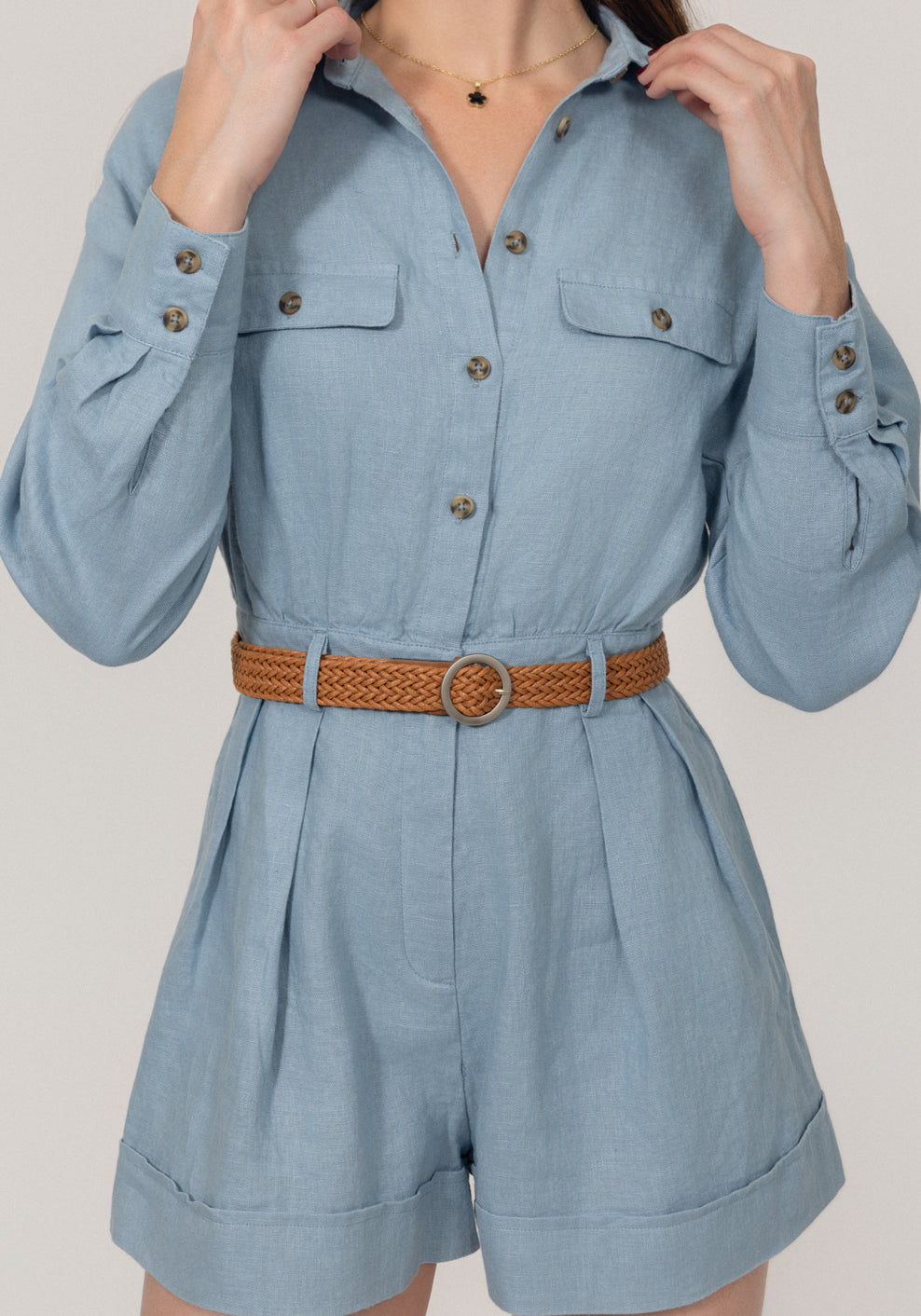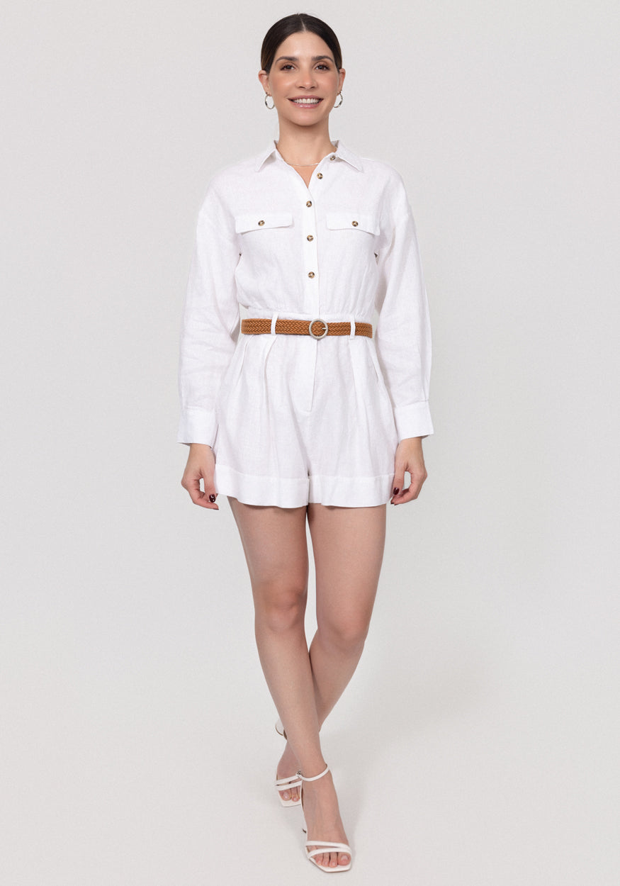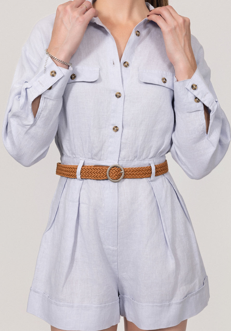 Styled for sunny days and effortless ease, this linen romper brings timeless comfort to your warm‑weather wardrobe. Made from breathable natural linen, it features a classic button‑down front and thoughtful design lines that flatter with relaxed sophistication. A woven belt is included to cinch the waist and shape your silhouette with ease, adding an understated accent to the clean, minimal cut. Subtle button details at the chest evoke a tailored feel while keeping the overall look light and free. Perfect for weekend escapes, outdoor lunches, or destination getaways, this romper balances casual comfort with refined style — a one‑and‑done piece you’ll reach for again and again.