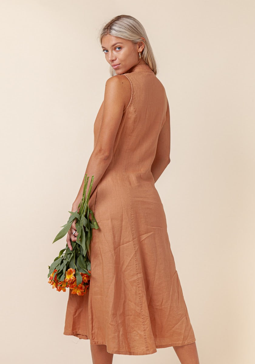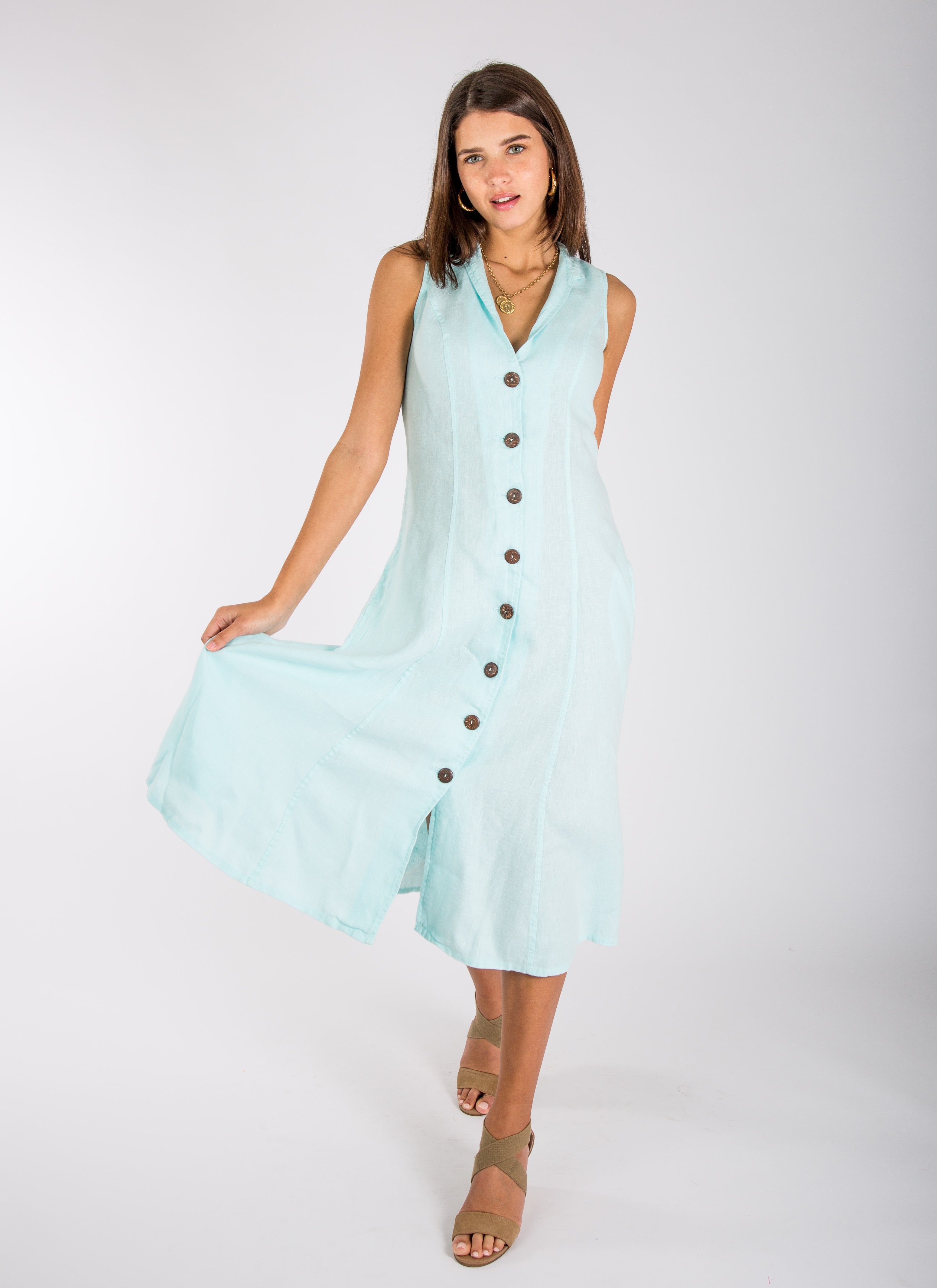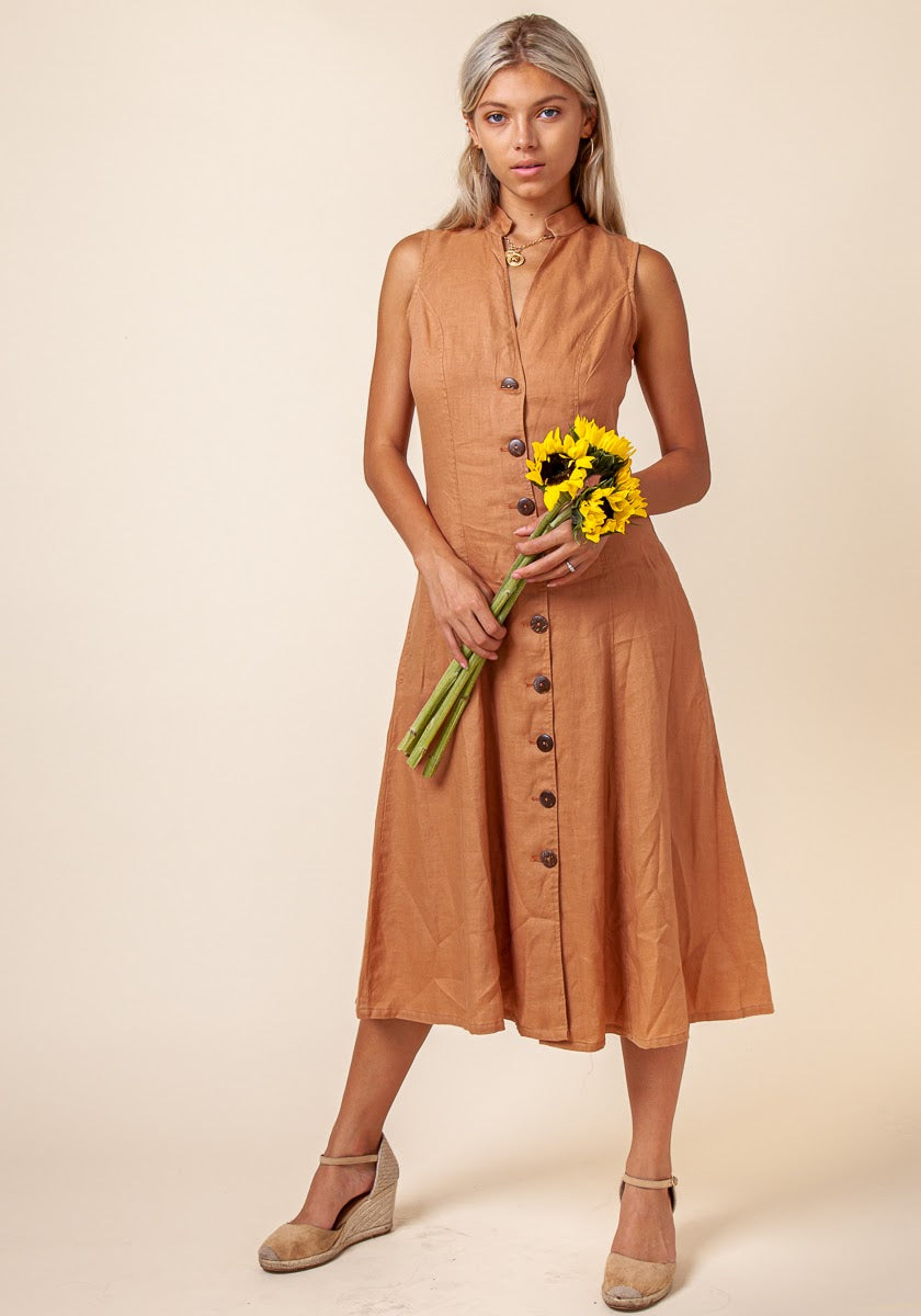 Indulge in sunset cocktails on an exotic peninsula, wearing this sleek linen dress that’s perfect for any getaway. Featuring natural coconut shell buttons and a feminine V-cut mao collar, it brings effortless allure to its clean, minimalist design. Whether you're exploring a charming coastal town or enjoying an intimate dinner by the sea, this dress will become your go-to. Pair it with a neck scarf for a polished, chic look that elevates your travel wardrobe.