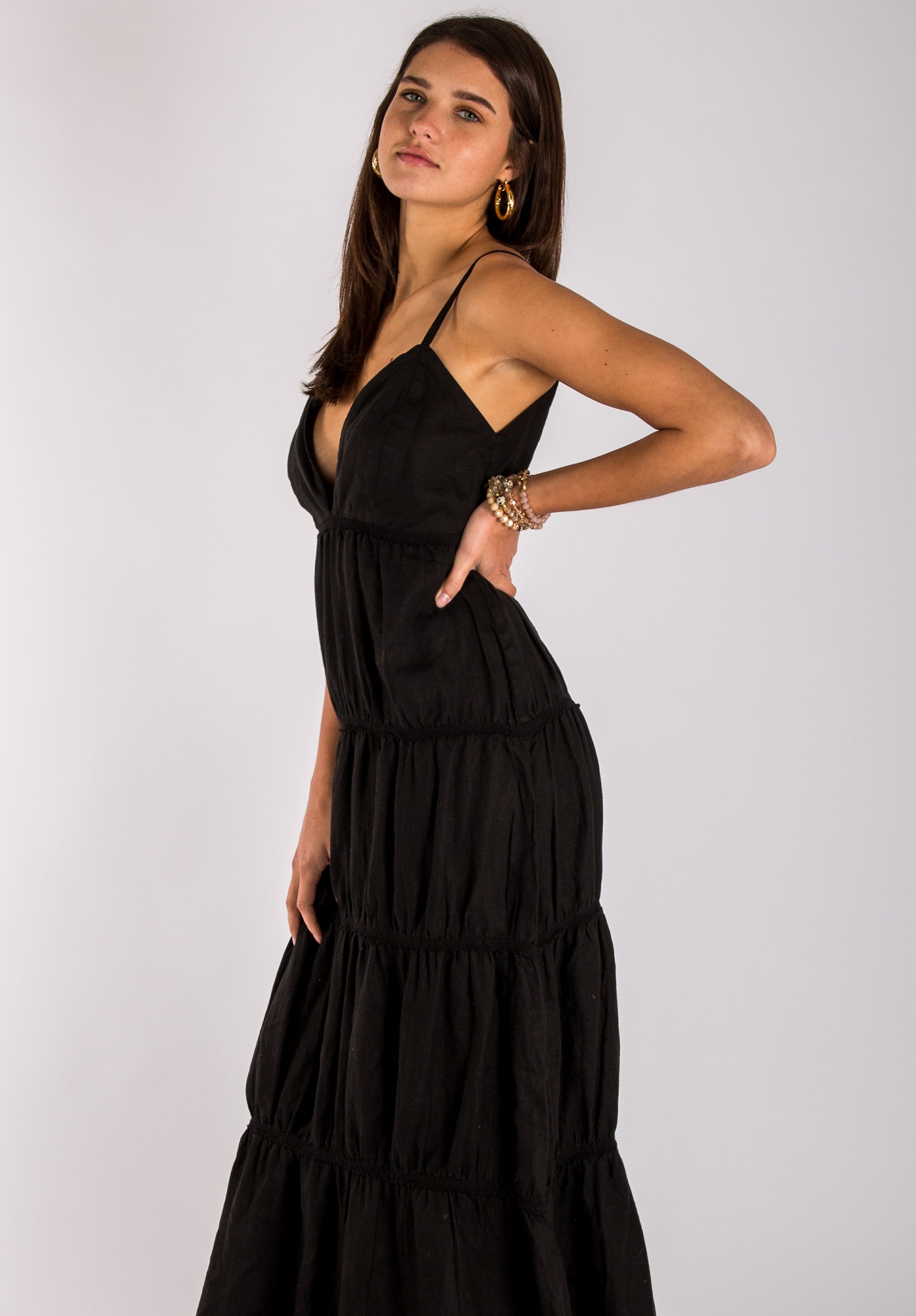 Awaken your inner goddess in this stunning lace detailed maxi dress. Featuring a sensual baby doll neckline and intricate lace bands, it creates a beautifully feminine look. The low back adds a touch of allure, making this dress perfect for a beach wedding or a dreamy island escape.